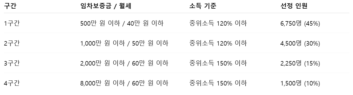 신청은 서울주거포털에서 6월 11일부터 24일까지 온라인으로 진행되며, 15,000명이 4개 구간별 전산 추첨을 통해 선정됩니다.
